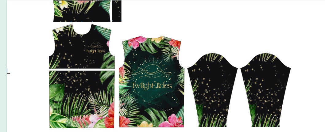 Who can resist the allure of a stylish tropical-inspired black shirt? Certainly not me! I envisioned crafting one with a unique twist, thus incorporating shimmering gold specks not only pays homage to my logo but also infuses an extra touch of elegance into the designs.